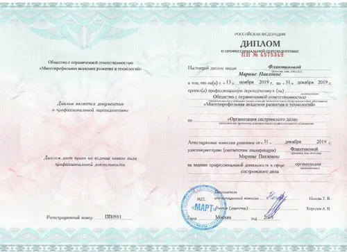 Флянтикова Марина Павловна, закончила ООО “Многопрофильную академию развития и технологий” по направлению - Сестринское дело.